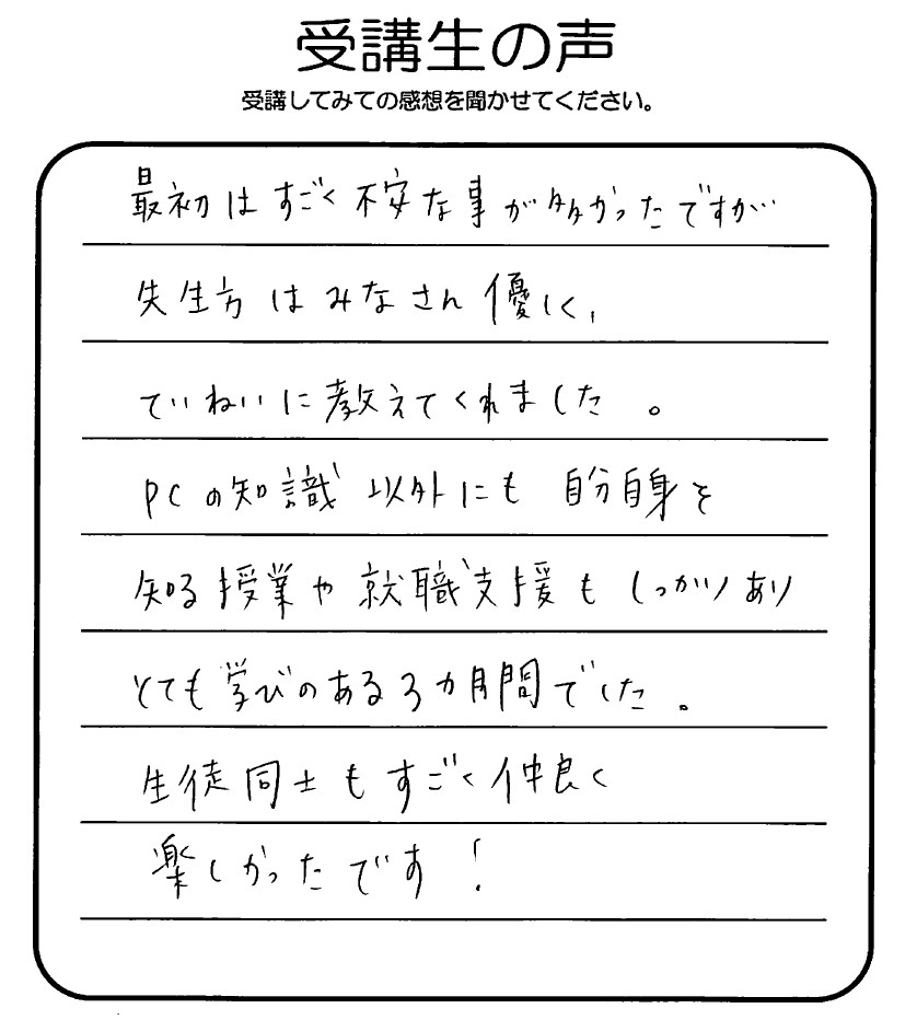 「最初は不安でしたが、先生方みなさん優しく丁寧に教えてくれました。PCの知識以外にも自分自身を知る授業や就職支援もしっかりありとても学びのある時間でした。生徒同士もすごく仲良く楽しかったです。」(40代女性)