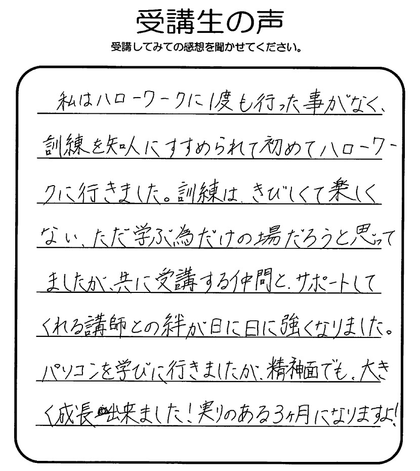 「訓練はきびしくて楽しくない、ただ学ぶだけの場だろうと思っていましたが、共に受講する仲間とサポートしてくれる講師との絆が日に日に強くなりました。パソコンを学びに行きましたが、精神面でも大きく成長できました。」(20代女性)