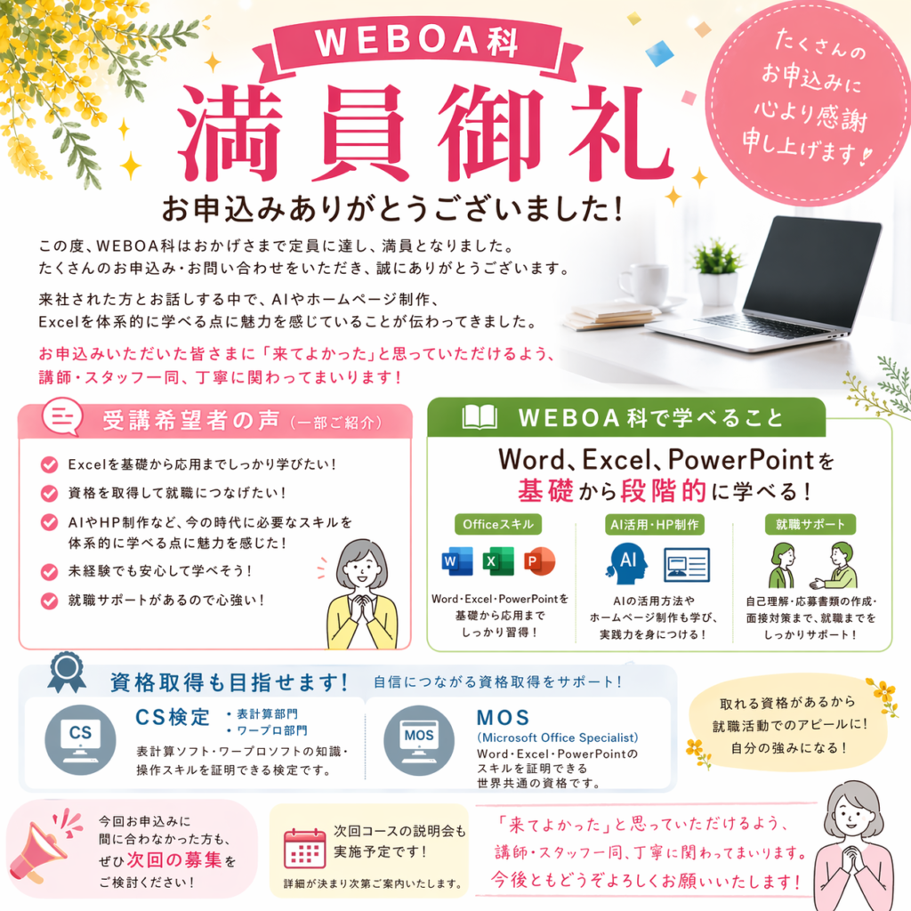 この度は、WEBも学べるOA事務科にたくさんのお申込みをいただき、誠にありがとうございました😊